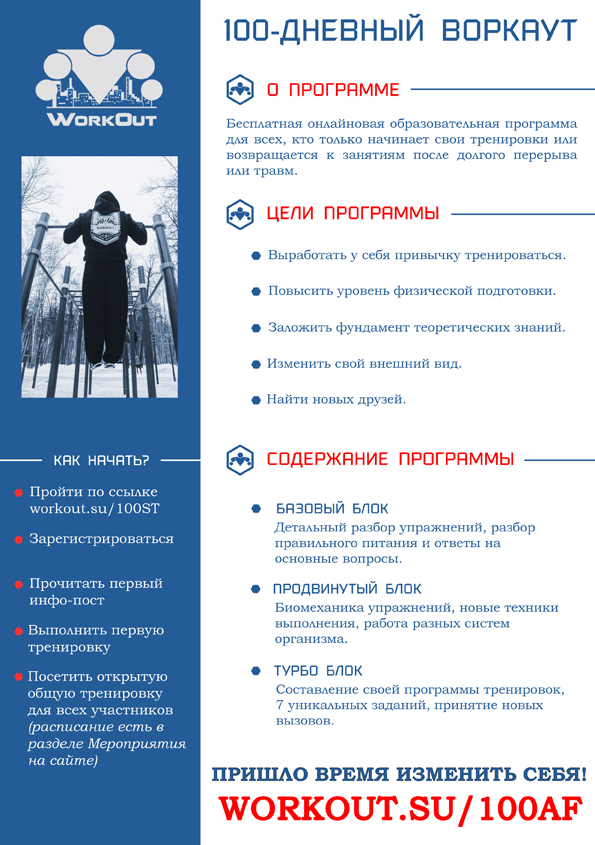 Программа 100-дневный воркаут была разработана в качестве образовательного курса для тех, кто только начинает свои тренировки или возвращается к занятиям после долгого перерыва или травм. Основу программы составляют круговые тренировки в комплексах по 3-4 упражнения, выполняемые друг за другом без отдыха. Дополнительно участники каждый день получают определенный блок информации в виде инфо-постов, которые содержат ответы на все основные вопросы.
